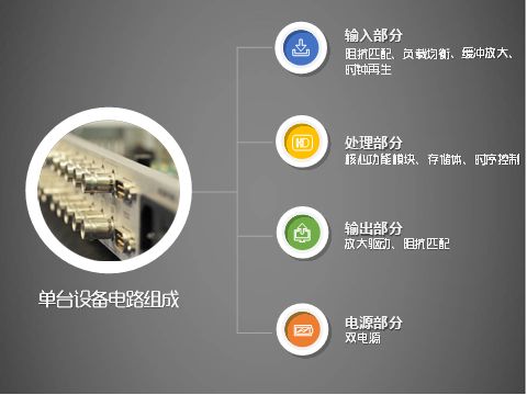 播出線上的切換器、幀同步機(jī)、鍵混器、響度控制器都是獨(dú)立的設(shè)備,我們稱之為“分體式”設(shè)備。每臺(tái)設(shè)備功能單一,自成一體。不管是哪種設(shè)備,都包含以下主要部分:輸入電路(阻抗匹配、緩沖放大、電纜均衡、時(shí)鐘再生)、控制電路、輸出電路(驅(qū)動(dòng)放大、阻抗匹配)、電源、接插件、機(jī)箱,另外就是功能模塊。